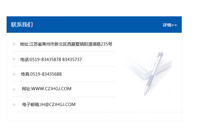 地址:常州市新北區友邦商務大廈1幢16、17層  電話:0519-85101652  傳真:0519-85112595  郵編:213022  網址:www.cz-jiayue_cn.hnlhfy.com  郵箱:xiajifengaa@163.com